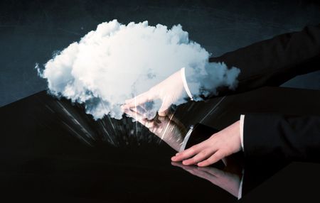 Male hands touching interactive table with a white cloud on it