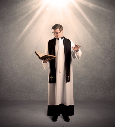 A male religious young priest in black and white dress giving his blessing, holding the holy bible while being illuminated from strong light beams coming from above concept