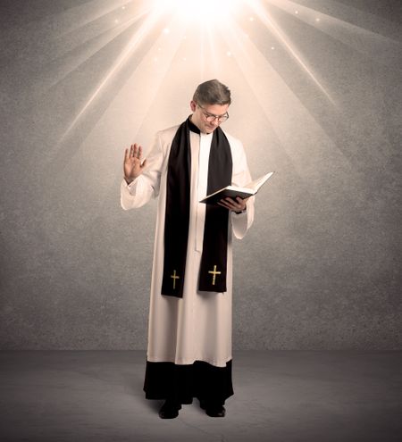 A male religious young priest in black and white dress giving his blessing, holding the holy bible while being illuminated from strong light beams coming from above concept