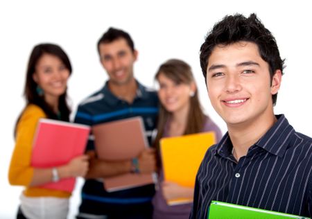 Male student with a group isolated over a white background