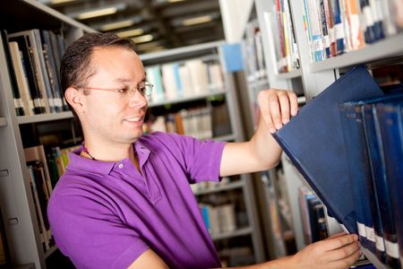 Male student at the library looking for a book