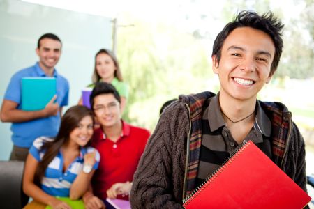 Male student at the university with a group of people behind