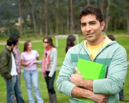 male university student standing outdoors with a notebook