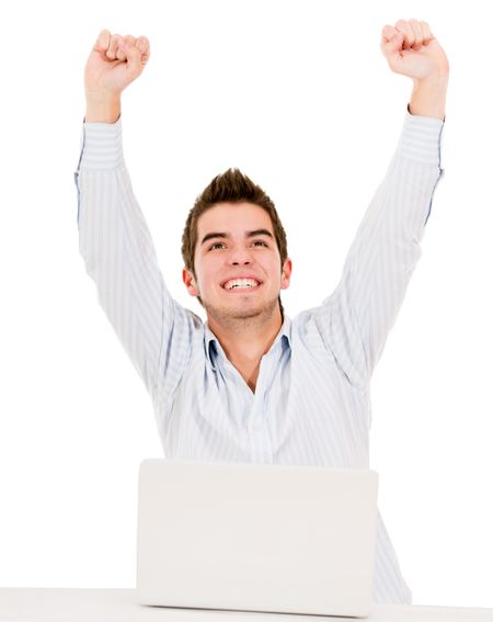 Man with arms up celebrating his online success - isolated over white