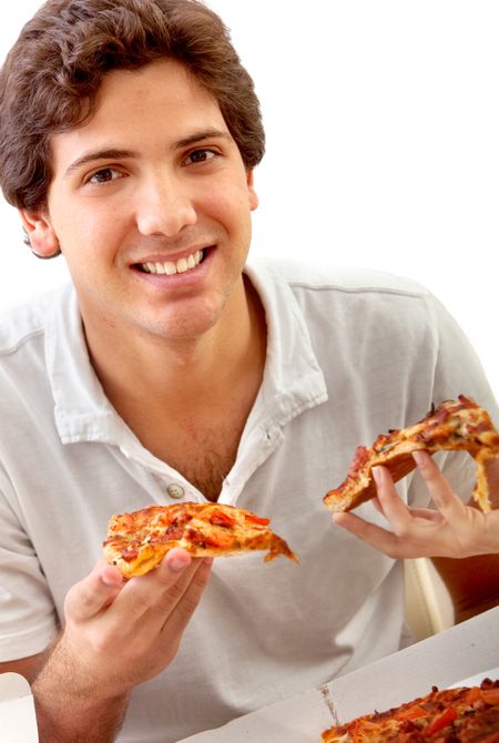 Man eating a delicious pizza isolated over white