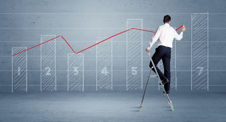 A man in elegant suit standing on a small ladder and drawing a chart on blue wall background with numbers, lines, blocks,
