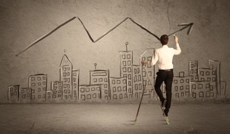 A man in elegant suit standing on a small ladder and drawing a line on brown wall background with buildings