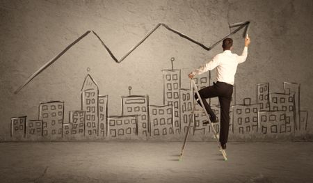 A man in elegant suit standing on a small ladder and drawing a line on brown wall background with buildings
