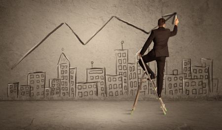 A man in elegant suit standing on a small ladder and drawing a line on brown wall background with buildings