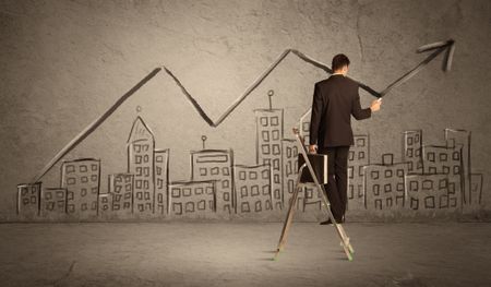 A man in elegant suit standing on a small ladder and drawing a line on brown wall background with buildings
