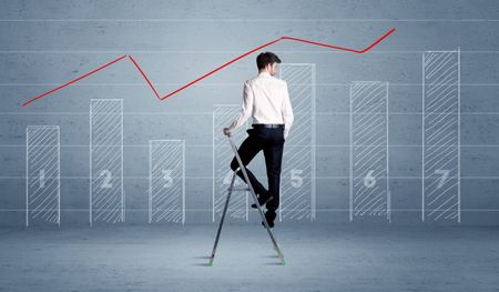 A man in elegant suit standing on a small ladder and drawing a chart on blue wall background with numbers, lines, blocks,