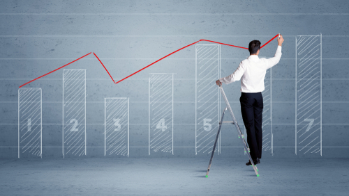 A man in elegant suit standing on a small ladder and drawing a chart on blue wall background with numbers, lines, blocks,
