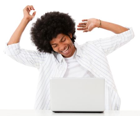 Man having fun on his laptop - isolated over a white background