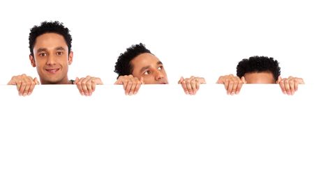 man hiding and peeking behind a white card