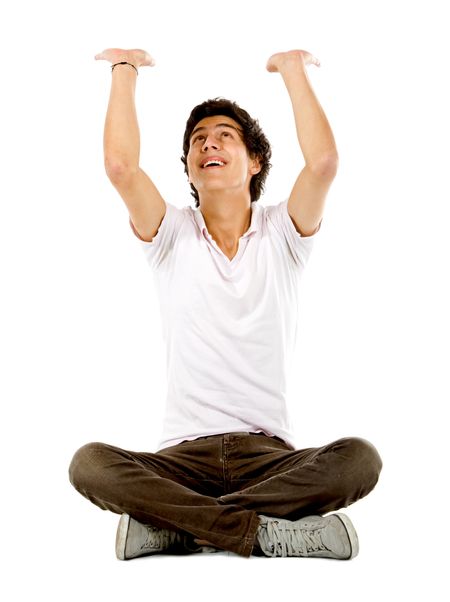 Man lifting an imaginary object isolated on white
