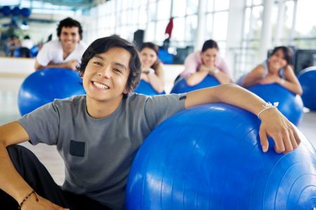 man portrait at the gym smiling with a pilates ball