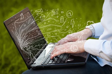 Man pressing notebook laptop computer with doodle icon media cloud symbols