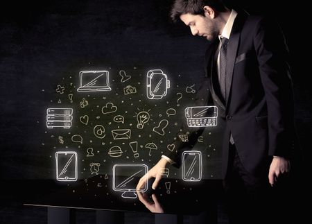 Man pressing table tablet hand touch interface with media icons and symbols