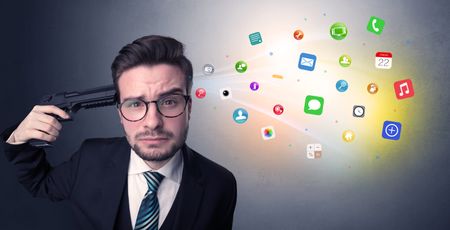 Man shoots his head with gun and application icons coming out from his head