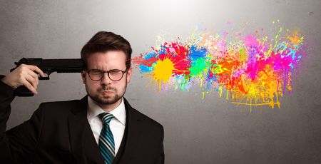 Man shoots his head with gun and colorful splotch are coming out from his head
