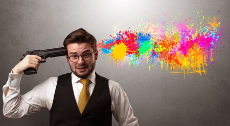 Man shoots his head with gun and colorful splotch are coming out from his head