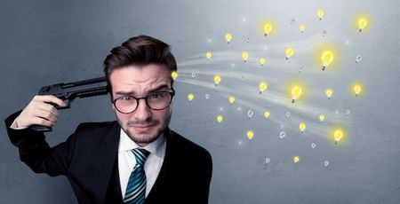 Man shoots his head with gun and idea bulbs are coming out from his head