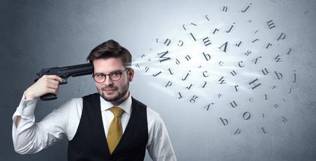 Man shoots his head with gun and letters are coming out from his head