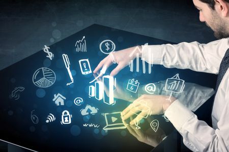 Man touching technology smart table with business icons and symbols