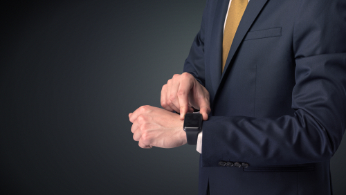 Man wearing suit with smartwatch on his wrist.