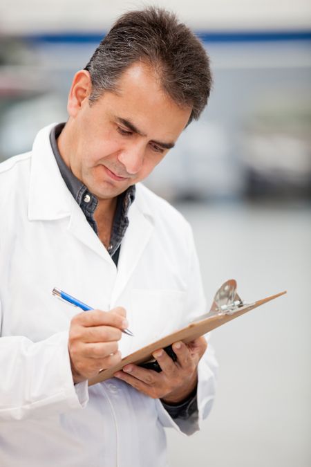 Man working as mechanic in a car garage and taking notes