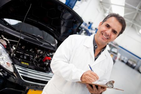 Man working as mechanic in a car garage and taking notes