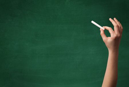 A mature hand writing or drawing on a clean green blackboard with a white chalk.