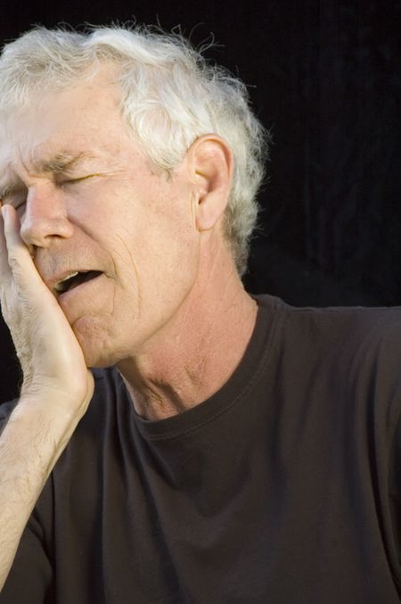 Mature white man with gray hair, eyes closed, head in right hand, mouth open, with expression of pain or regret or dismay