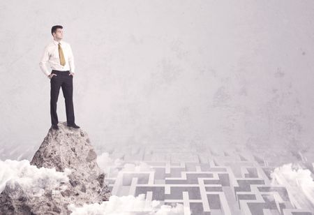 Maze is no challenge for successful businessman standing on top of a cliff as he is the best at solving problems concept