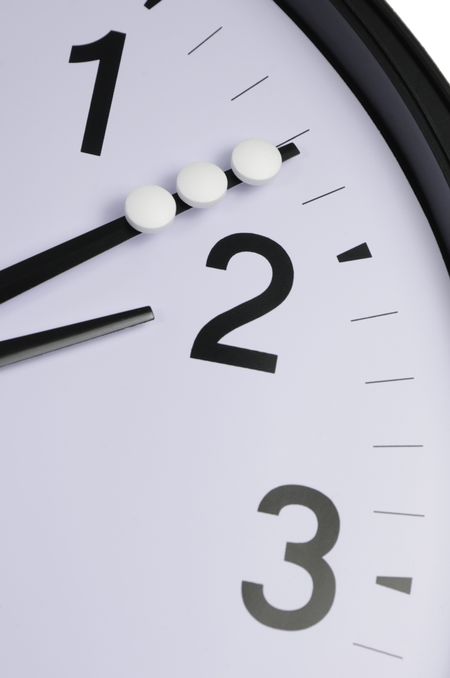 Medical macro: Three aspirin on the minute hand of an analog wall clock