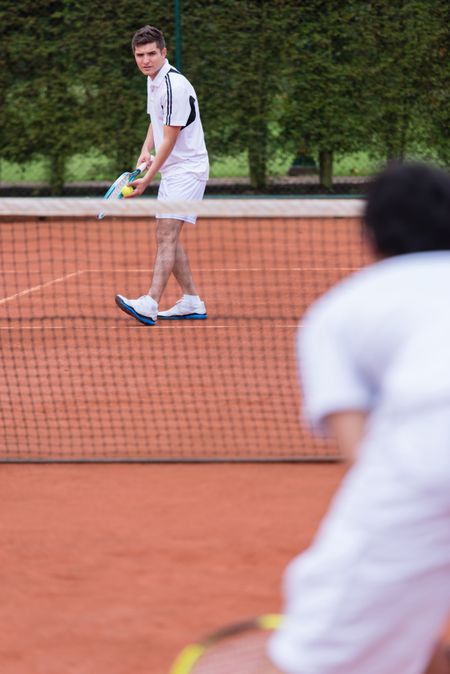 Men playing a tennis match at the court