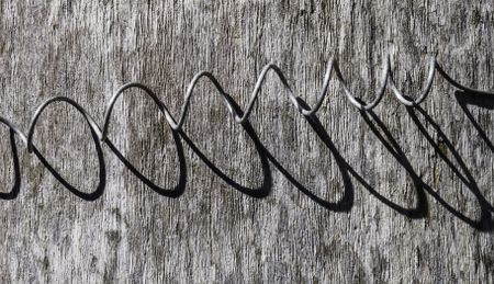 Metal coil with parabolic shadows cast by sunlight on weathered wood