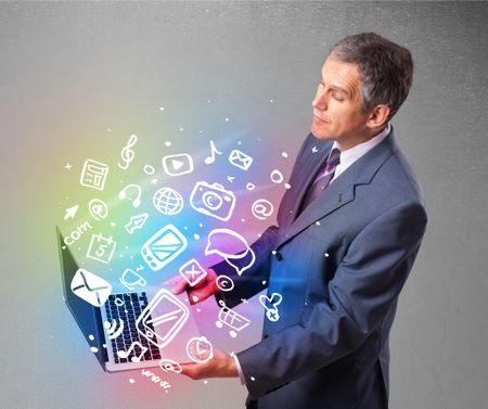 Middle aged businessman holding notebook with colorful hand drawn multimedia icons