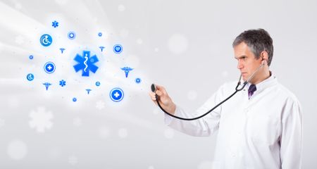 Middle aged doctor with blue medical icons