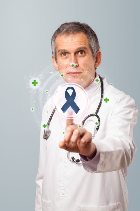 Middle aged doctor standing and pressing modern medical type of button