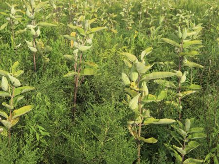Many milkweed plants (genus: Asclepias) with unopened pods in prairie, late summer in Illinois