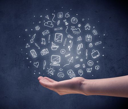 Mixed white media and communication related icons hovering above young hand