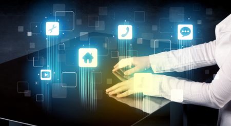 Modern smart table with high tech icons on its interface screen concept
