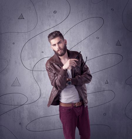 A modern young male in casual fashion style clothing making funny facial expressions while standing