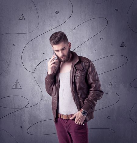 A modern young male in casual fashion style clothing making funny facial expressions while standing