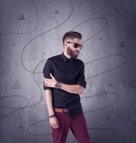 A modern young male in casual fashion style clothing making funny facial expressions while standing