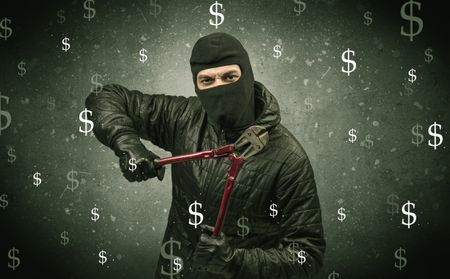 Money hungry thief in black clothes and tolls on his hand.