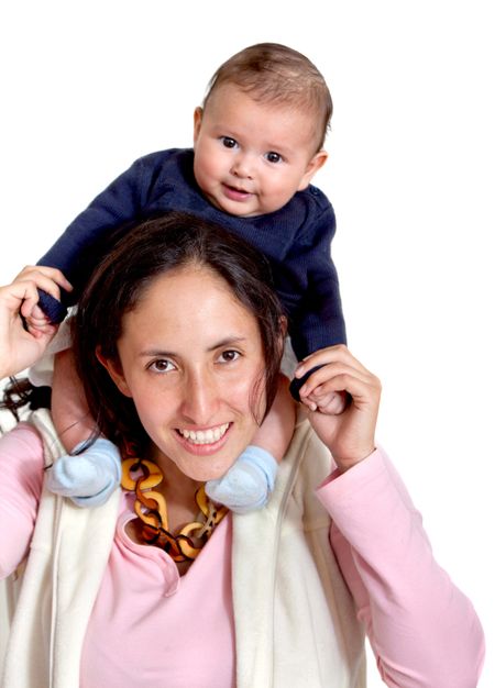 Mother carrying her cute child isolated on white