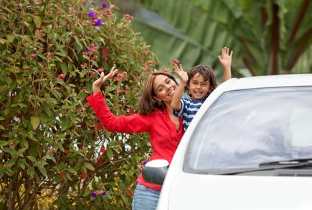 Mother and son standing by the car