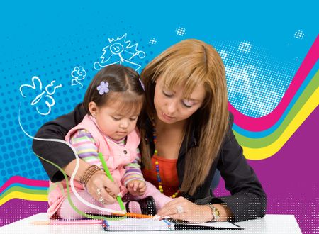 mother teaching her little girl to draw with some colours
